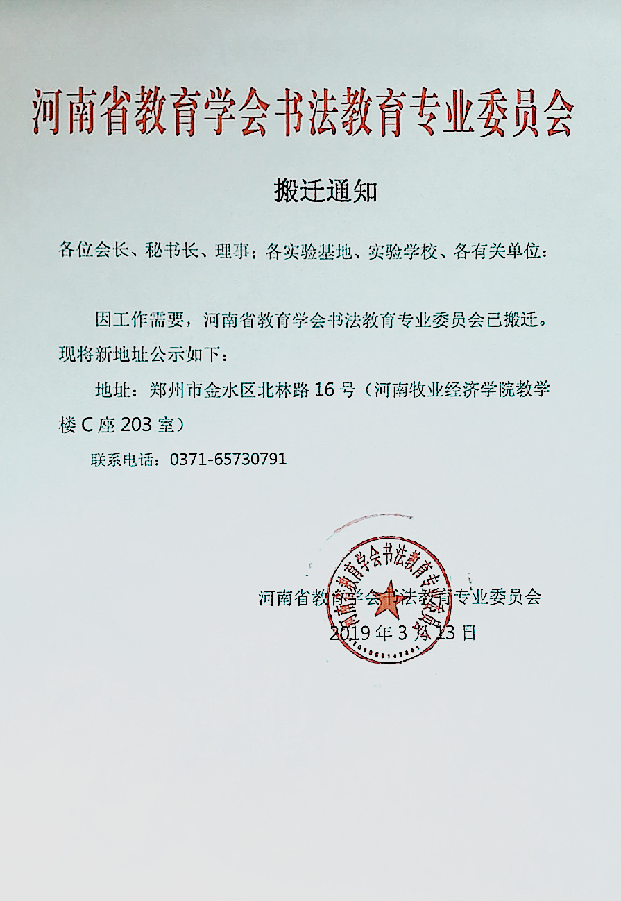 河南省教育学会书法教育专业委员会搬迁通知